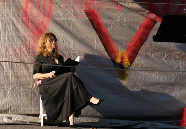 We had less than three weeks of rehearsals, no tech whatsoever, and a myriad of rules to follow in accordance with the city of Syracuse: masks were worn whenever the actors were off stage and/or not speaking; hand sanitizer was readily available; our actors and audiences were spaced six feet apart; and the actors used their own personal windscreens when using the four microphones.